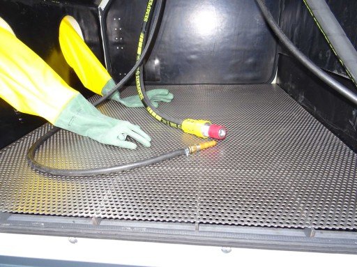 Ściany kabiny wykonane są z blachy o grubości 3 mm, dodatkowo wyłożone są odpornymi na ścieranie płytami z gumy. Stół roboczy o nośności 200 kg wykonany jest z blachy perforowanej o grubości 3 mm wspartej na kratownicy z płaskowników o grubości 6 mm. Otwory w bocznych drzwiach umożliwiają oczyszczanie długich elementów. Integralne oświetlenie zamontowane jest na górnej ścianie kabiny i składa się z dwóch lamp LED o mocy 50 W każda.