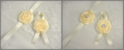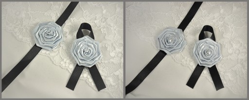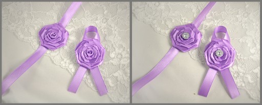 Podwiązki wykonujemy z personalizacją ( np. imiona, data ) , mogą być one również ozdobione kryształkiem, tak aby stanowiły komplet z kotylionami.