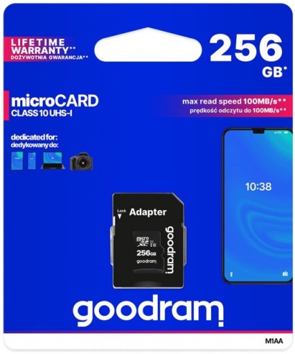GOODRAM 256GB microSDXC class 10 UHS I + adapter to karta pamięci o formacie microSD HC w zestawie z adapterem do formatu SD. Karta pamięci ma pojemność 64GB, a dzięki interfejsowi UHS-I zapewnia odczyt danych z prędkością do 100MB/s. Maksymalna szybkość zapisu wynosi 10Mb/s. Ze względu na solidne wykonanie karta pamięci charakteryzuje się odpornością na wstrząsy oraz promieniowanie magnetyczne.