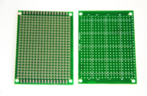 Uniwersalne obwody drukowane przeznaczone do montażu elementów przewlekanych z powierconymi otworami 1mm w rastrze 2.54mm. Można też lutować elementy SMD, płytka jest bardzo sztywna i nie ma niebezpieczeństwa pękania małych elementów. Na dwóch krawędziach są powiększone pady bez otworów a w rogach otwory fi 3mm.