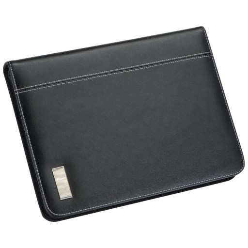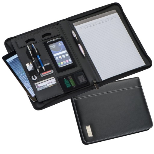 Folder A4 z materiału imitującego skórę. Posiada kieszeń na tablet, kieszenie na wizytówki, kieszeń i podstawkę pod telefon, szlufki na długopisy oraz notes w linie z małym kalendarzem. Zamykany na zamek błyskawiczny.