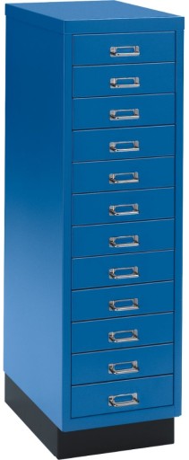 Metalowa szafka z szufladami zamykana zamkiem centralnym. Każda szuflada z praktycznym uchwytem. Wnętrza szuflad można podzielić za pomocą plastikowych wkładów. Uchwyty na etykiety na frontach szuflad umożliwiają czytelną identyfikację zawartości. Szafka na metalowym cokole o wysokości 80 mm.