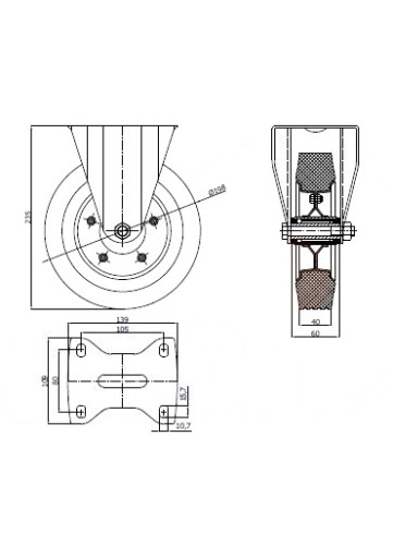 Koła metalowo – gumowe w obudowach stałych są bardzo powszechnie stosowane. Obudowa koła wykonana jest ze stali, posiada płytkę mocującą z 4 otworami. Koło występujące w tej obudowie montowane jest za pomocą tulejki, śruby i nakrętki. Całość pokryta jest warstwą ocynku, który zabezpiecza przed korozją. Koła montowane w takich zestawach wyróżniają się cichą pracą i nie niszczą podłoża, ponadto są odporne na uderzenia i doskonale tłumią drgania. Opona standardowa wykonywana jest w kolorze czarnym. Natomiast istnieje możliwość wykonanie z szarej mieszanki zapewniającej niepozostawianie śladów na podłożu.