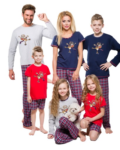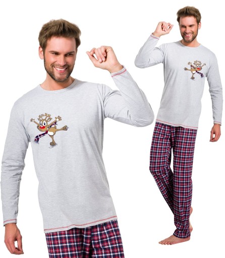 Klasyczna piżama męska złożona z gładkiej bluzki z uroczym reniferem, zestawionej ze spodniami w zawsze modną kratkę. Dekolt wykończony ściągaczem. Kontrastowe przeszycia przy rękawach i na dole bluzki.