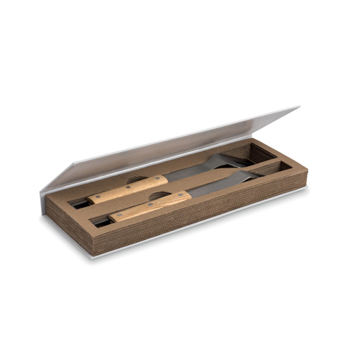 Zestaw 2 narzędzi do grilla, wykonanych ze stali nierdzewnej. Zamknięty w pudełku w kształcie książki.
