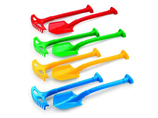 Dodatkowo zestaw uzupełniają duże grabie i łopata. Dziecko może je wykorzystać do prac w ogrodzie, ale również do prac plażowych w celu poszukiwania skarbów.