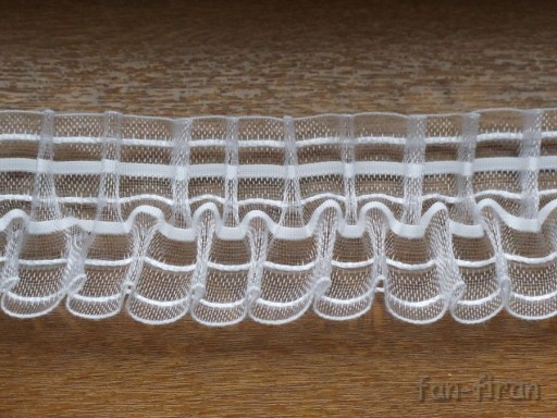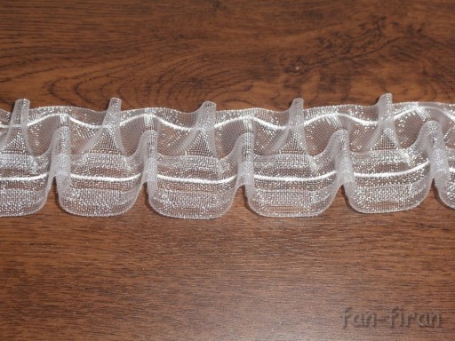 przed zmarszczeniem (+/- 2cm) uszytą po łuku lub na prosto na taśmie transparentnej z dodatkiem pomponów: