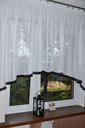 Firanka bardzo ekskluzywna w kolorze złamanej bieli ( zimny odcień bieli)i bardzo modny trend- POMPONY nic lepszego nie można sobie wyobrazić i w dodatku w przystępnej cenie.
