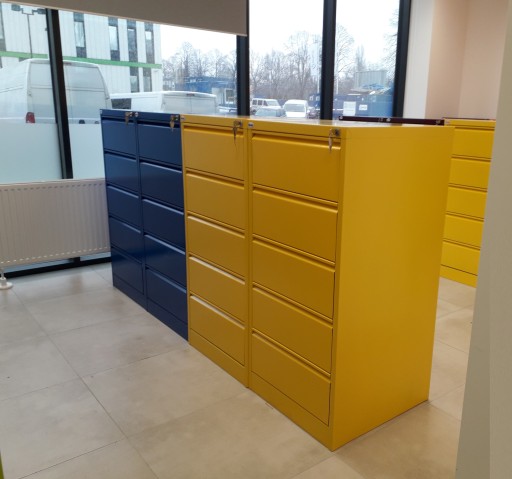 Przeznaczenie: szafy do przechowywania kart z historią pacjentów. 5-szufladowa szafka kartotekowa SZK 318 do kopert B5 poziomo. Korpus szafki, fronty szuflad wykonane z blachy stalowej gr. 1,0 mm, wieniec dolny z blachy ocynkowanej, pozostałe części szuflad z blachy gr. 0,8 mm. Szuflada przystosowana na dwa rzędy kartotek, na prowadnicach kulkowych o podwójnym wysuwie i z zabezpieczeniem przed wypadaniem. W każdej szufladzie po 2 przegrody ruchome typu „L”. Centralne ryglowanie szuflad. Maksymalny wymiar przechowywanego dokumentu 215 x 258 mm. Maksymalne obciążenie szuflady 50 kg.