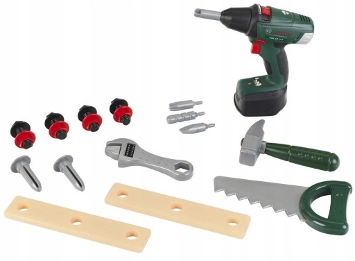 Wśród narzędzi dzieci odnajdą bezprzewodową wkrętarko-wiertarkę na baterie z czterema wymiennymi końcówkami. Wkrętarko-wiertarka doskonale naśladuje prawdziwe urządzenie Bosch, dzięki dźwiękom oraz obrotowemu wkrętowi.