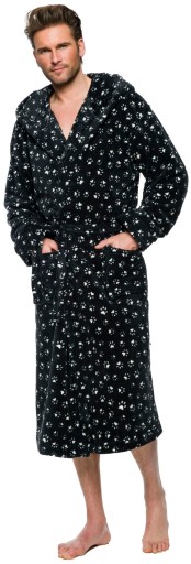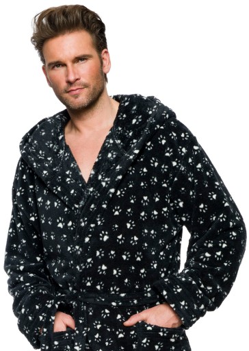 Szlafrok męski z kapturem, wiązany w pasie, z miękkiej dzianiny (soft), na biodrach kieszenie zewnętrzne, całość w psie łapki.