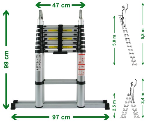 W pozycji rozstawnej drabina ma wysokość od 99 do 250 cm.