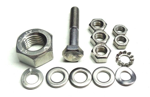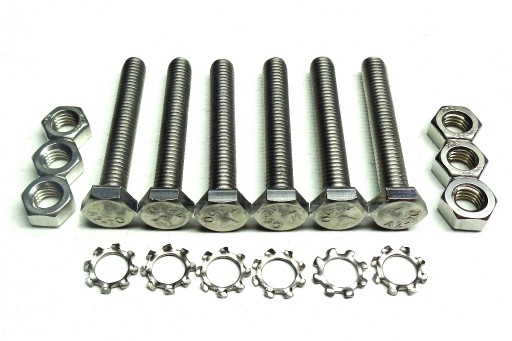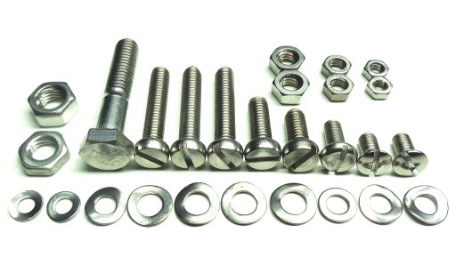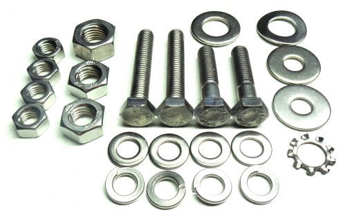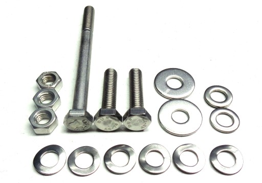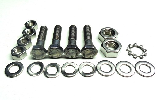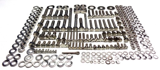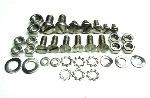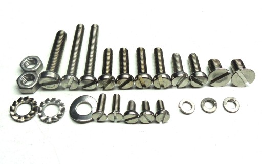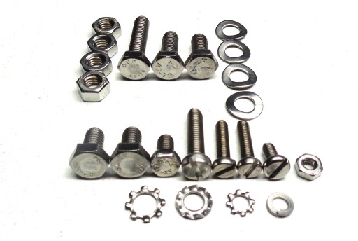 Komplet złożony jest z chromoniklowych elementów nierdzewnych wykonanych w klasie A2 70. W skład kompletu wchodzą śruby, wkręty, nakrętki i podkładki podzielone na 16 osobno spakowanych grup, umożliwiających bezproblemowy montaż poszczególnych elementów motocykla.