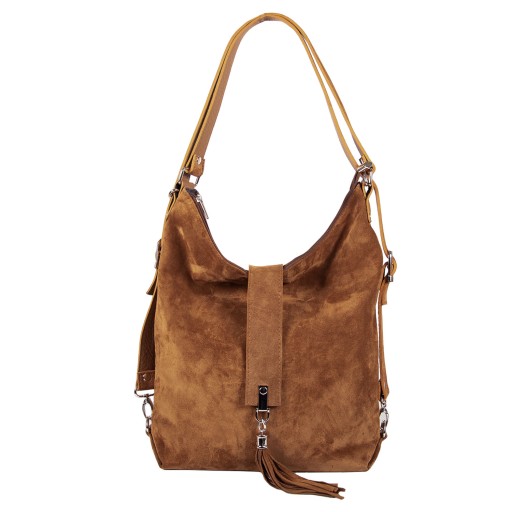 Uszyta w Polsce skórzana torebka PLECAK z wysokogatunkowej naturalnej skóry licowej z fakturą groszku połączonej z zamszem. Zamykana od góry na zamek. Wewnątrz dwie komory, dwie kieszonki na zamek + kieszonka na telefon. Z tyłu pojemna kieszeń na zamek. Wnętrze wykończone podszewką. Okucia w kolorze srebrnym. Można nosić na ramieniu jak torebkę lub na plecach jako plecak. Torebka z ozdobnym frędzlem.