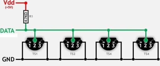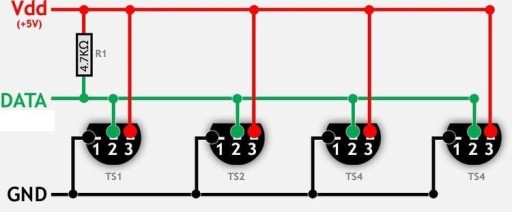Do protokołu One - Wire można podłączyć więcej niż jeden czujnik danych, dzieki czemu dwoma przewodami można odbierać więcej informacji np. temperaturę z dwóch czujników DS18B20.