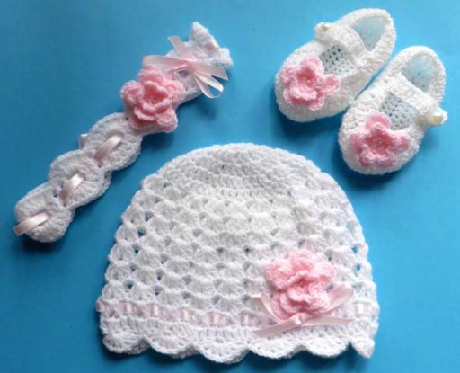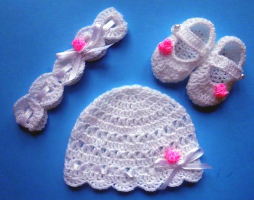 8. Biel+róże szydełkowe różowe, czapeczka wachlarzyki, buciki wiązane.