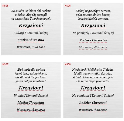 Postaramy się, aby dedykacja prezentowała się jak najbardziej estetycznie. Wielkość tabliczki dopasujemy do nadesłanej treści oraz wielkości srebrnego obrazka. Całość zostanie wyśrodkowana, a imię dziecka pogrubione. Dobrze, aby długość tekstu była podobna do zamieszczonych niżej przykładów. Domyślnie używamy czcionki Georgia Italic z uwagi na jej stylowy wygląd oraz czytelność przy różnych wielkościach, jeśli jednak wolisz inny krój tekstu daj nam o tym znać w treści wiadomości.