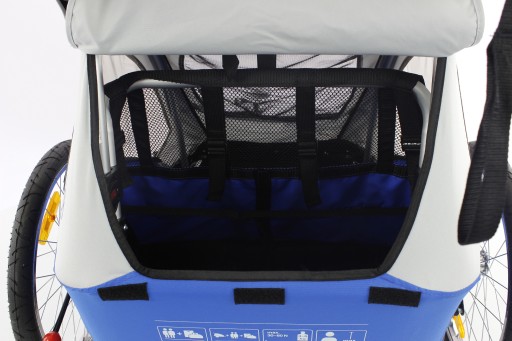 Lekka, komfortowa przyczepka dwuosobowa, wyposażona we wszystkie udogodnienia oraz zabezpieczenia dla dzieci.