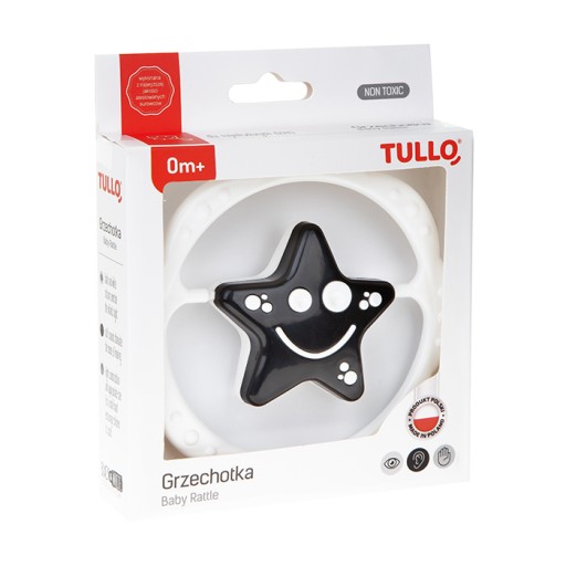 Piękna czarno-biała grzechotka przeznaczona dla najmłodszych dzieci. Takie zestawienie kolorystyczne idealnie stymuluje zmysł wzroku u niemowlaka, który nie rozróżnia jeszcze barw.