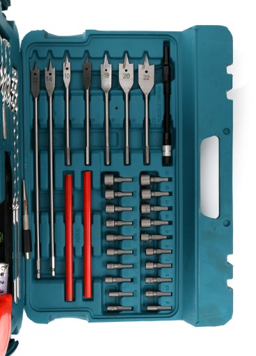 Mega zestaw zawierający między innymi wiertła do betonu, drewna i metalu, a także bity typu imbus, torx, płaskie, krzyżowe, i wiele innych