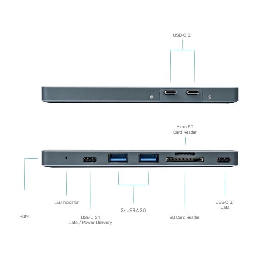 Mimo niewielkich rozmiarów stacja dokująca zapewni Ci pełną łączność, której potrzebujesz w biurze lub w podróży. Port HDMI może bezproblemowo podłączyć Cię do zewnętrznego monitora, telewizora lub projektora, nawet do 4K (3840 x 2160 / 30Hz). Czytniki kart MicroSD i SD będą przydatne np. przy kopiowaniu danych / zdjęć z aparatu, smartfona lub dowolnego innego urządzenia. Porty USB 1x USB-C i 2x USB 3.0 (kompatybilny z USB 3.1 / 3.0 / 2.0) są gotowe do podłączenia wszystkich Twoich ulubionych urządzeń. Ładowanie również nie stanowi problemu – wystarczy podłączyć ładowarkę do portu ładowania USB-C i wszystko gotowe!