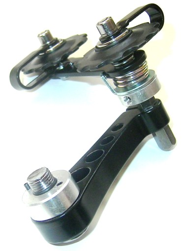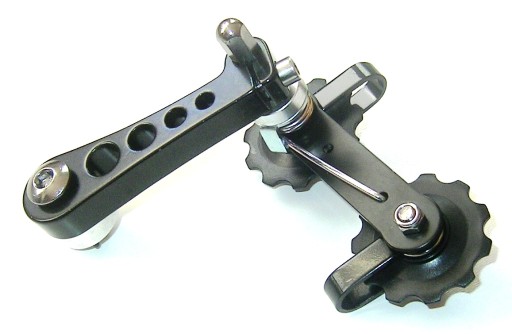 Lekki napinacz łańcucha. Montowany do haka, w miejsce tylnej przerzutki. Napinacz posiada 2 kołeczka 11T, regulacja w poziomie. Łańcuch jest zabezpieczany przed spadaniem z kółeczek poprzez specjalne pałąki.