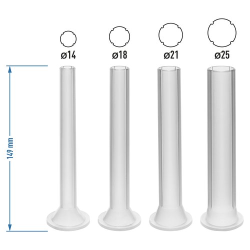 - 4 lejki w różnych rozmiarach: 14; 18; 21 25 mm;