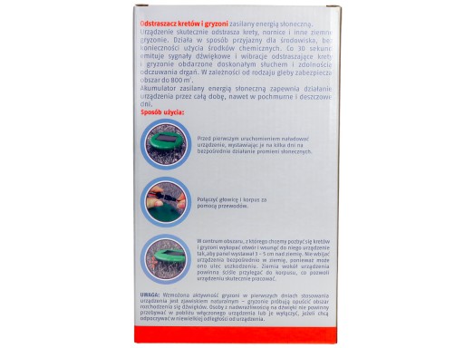 Odstraszacz może również posłużyć jako odstraszacz nornic, myszy polnych, susłów oraz innych mniejszych zwierząt, których obecności nie chcielibyśmy doświadczyć w okolicy.