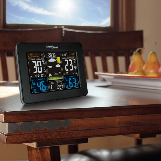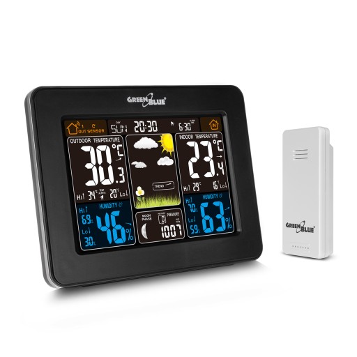 Nowoczesna stacja pogody GreenBlue GB523 z dużym, czytelnym wyświetlaczem.