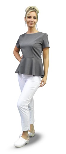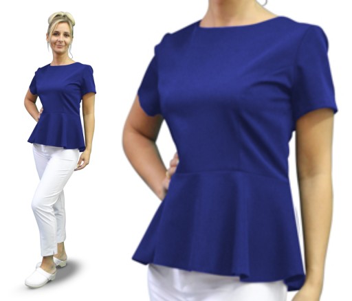 Fartuch z krótkim rękawem posiada prosty dekolt w łódkę i delikatne zapięcie na suwak z tyłu.