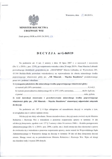 Nasz środek poprawiający właściwości gleby NB Minerals – Mączka Bazaltowa został gruntownie przebadany przez jednostki badawcze oraz został dopuszczony do obrotu przez Ministerstwo Rolnictwa i Rozwoju Wsi - Decyzja nr G-869/19.