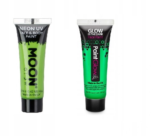 PaintGlow UV Neon Face Paint są to farby, które świecą w świetle ultrafioletowym. Można nimi malować na ciele i na twarzy. Farbki są zapakowane w tubki po 12ml. Farbami należy malować na czystej odtłuszczonej skórze. Świetne na imprezy urodzinowe i inne okazje do zabawy. Bardzo łatwo zmywają się woda z mydłem. Firma PaintGlow posiada certyfikat ISO 9001:2008, co oznacza, że wszystkie produkty Paintglow są kosmetycznie certyfikowane do najwyższych standardów. Na zdjęciu widać jak kredki świecą w świetle ultrafioletowym, aczkolwiek zdjęcie nie oddaje ich rzeczywistych możliwości w UV. Kolejna fotografia pokazuje, jak farba wygląda, po jednokrotnym malowaniu na skórze kolorem białym. Jedną farbą 12ml namalowaliśmy prostokąt o rozmiarze 30cm x 17cm. Proszę wziąć pod uwagę, że jest to produkt kosmetyczny, gdzie krycie i wydajność podlegają indywidualnej ocenie klienta.