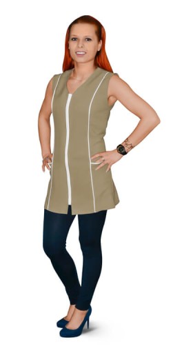 Fartuch ma dekolt z wycięciem w serek, dzięki czemu świetnie się układa.