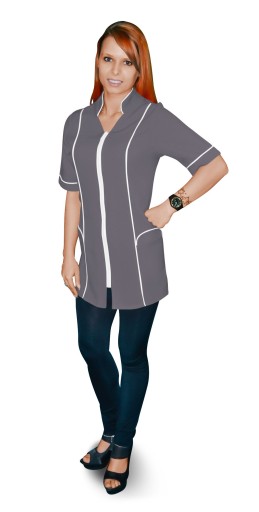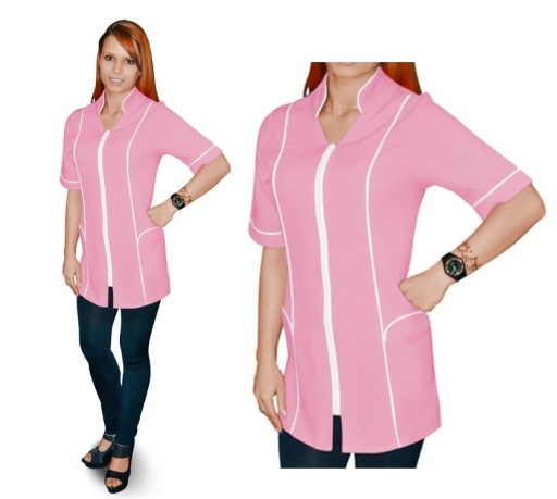 Fartuch zapinany jest na zamek w takim samym kolorze jak lamówka. . Rękaw sięga do łokcia, a cały fartuch ma długość do połowy uda.