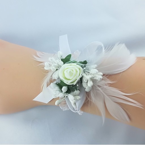 Ozdoba wykonana jest z piankowego kwiatka, trzech dekoracyjnych ryżyków, piórek i kokardki ze wstążki o szerokości 1cm. Wszystko umocowane jest na gumokoronce, dopasowując się idealnie do ręki.