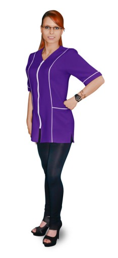 Fartuch zapinany jest na suwak, którego kolor jest tożsamy z kolorem lamówki użytej do obszycia.