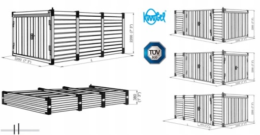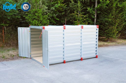- Kontener można złożyć do pozycji transportowej, dzięki czemu można znacznie obniżyć koszty transportu. Bardzo prosty sposób demontażu daje możliwość montażu kontenera w miejscach trudno dostępnych.