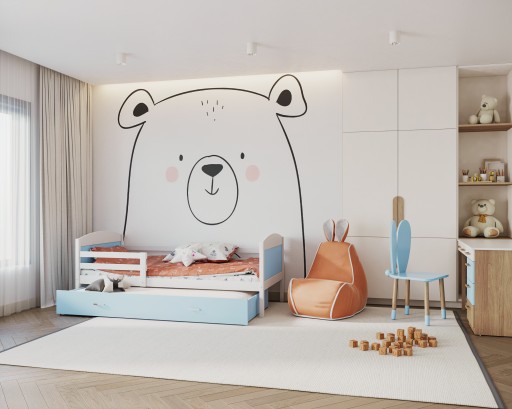 - Pojemna szuflada wysuwana na kółkach. Może służyć jako pojemnik na pościel lub zabawki (szuflada jest oddzielnym elementem łóżka).