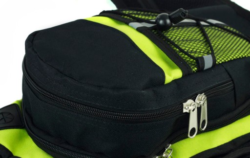 Plecak został wyposażony w regulowany pas piersiowy oraz biodrowy spinane na zatrzaski, profilowane szelki oraz delikatnie usztywnione plecy.