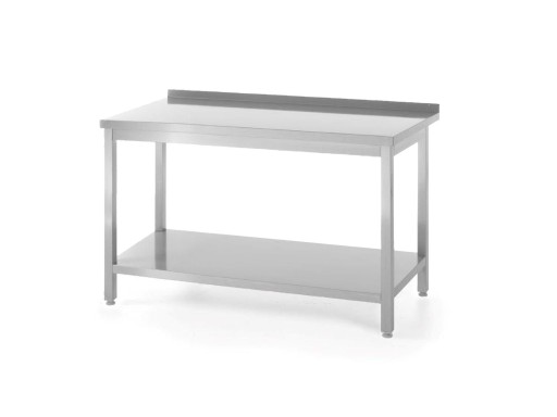 Stół wykonany został z trwałej, odpornej na korozję a przy tym łatwej w utrzymaniu w higienicznej czystości stali nierdzewnej AISI 430. Blat o wymiarach 180 x 60 cm wzmocniony został profilem stalowym. Rant o wysokości 40 mm chroni ścianę przez zabrudzeniami. Pod blatem umieszczono półkę, która pozwoli na wygodne przechowywanie np. garnków czy rozmaitych akcesoriów kuchennych.