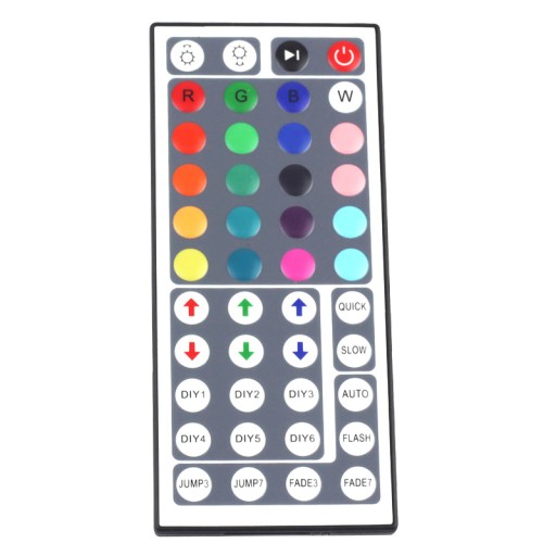 12 przycisków systemu "DIY" - manualne ustawienie koloru świecenia, poprzez zwiększanie i zmniejszanie barwy każdego z kolorów RGB (czerwonego, zielonego, niebieskiego).