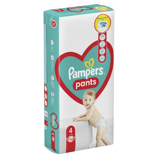 Pieluchomajtki Pampers Pants mają rewolucyjną KIESZONKĘ STOP & PROTECT, która wraz z pełnym dopasowaniem 360° zapewnia do 12 godzin pełnej ochrony przed przeciekaniem. Oprócz tego mają chłonny wkład, który błyskawicznie wchłania wilgoć, oraz podwójną osłonkę wokół nogawek, która zapobiega przeciekaniu w okolicach nóżek. Jeśli Twoje dziecko wierci się podczas przewijania, pieluchomajtki Pampers Pants będą doskonałym wyborem, bo dzięki elastycznej taśmie wokół talii ich zakładanie i zdejmowanie jest wyjątkowo łatwe. Aby zdjąć pieluchomajtki, rozedrzyj ich boczki, zwiń je, zabezpiecz taśmą i wyrzuć.