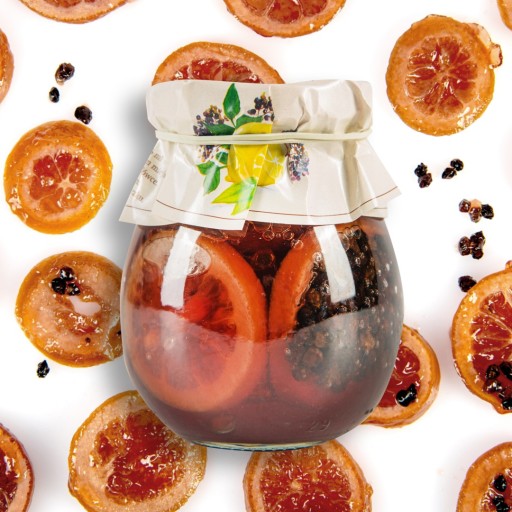 Plastry cytryny w słodkim syropie z dodatkiem owocu czarnego bzu.