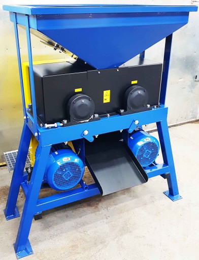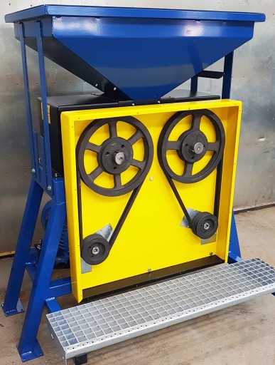 Zgniatacz - gniotownik dwusilnikowy do wszystkich rodzajów zboża, kukurydzy, grochu itp. Napęd każdego walca osobnym silnikiem za pomocą dwóch pasków na każdy walec jest dużo trwalszy w porównaniu do napędu za pomocą kół zębatych, które szybko się zużywają. Zgniatacz podczas testów na ziarnach kukurydzy rozdrobnił 100 kg w 82 sekundy.