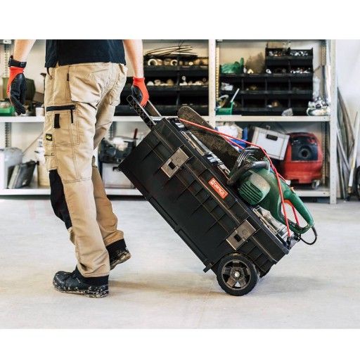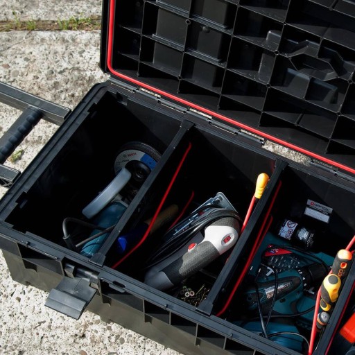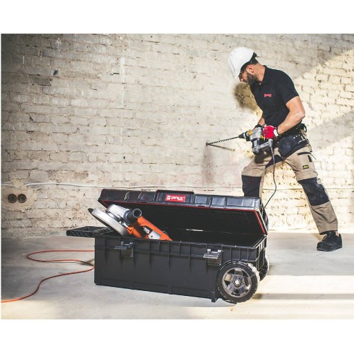 - Mobilna skrzynia narzędziowa pozwala na przewożenie długich elektronarzędzi jak np. młoty udarowe, szlifierki kątowe lub mieszadła do cementu wraz z niezbędnymi akcesoriami.