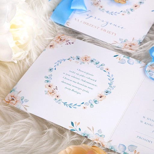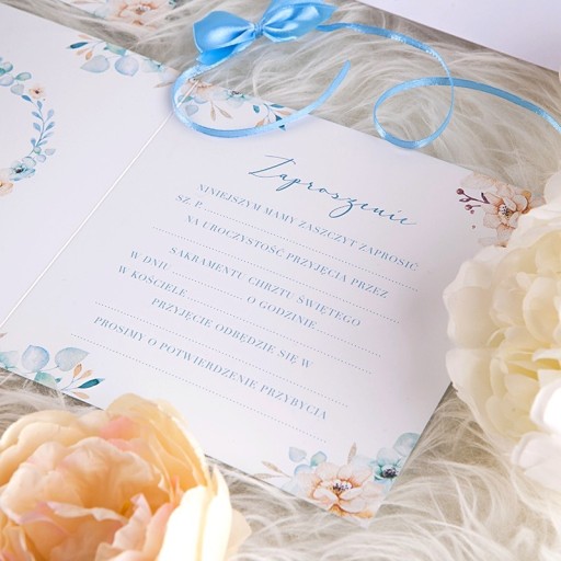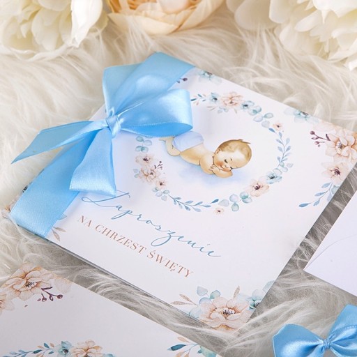 - zaproszenia wykonane są w odcieniach błękitu i jasnej brzoskwini, dekorowane motywem śpiącego chłopca oraz kwiatowego wianuszka