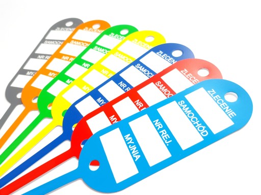 Zawieszki posiadają dwa duże okienka do wypełnienia. Nadają się do oznaczania kluczyków, części i innych przedmiotów. Zawieszki wykonane są z elastycznego i odpornego na zrywanie surowca. Posiadają długi pasek spinający co pozwala na zamieszczenie zawieszki przy każdym modelu kluczyka.