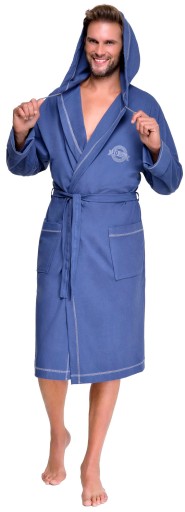 Towar bardzo starannie wykończony. Wykonany z bawełny która jest bardzo lekki a zarazem miła w dotyku. PRODUKT POLSKI Szlafrok męski z kapturem, wiązany w pasie, z miękkiej bawełny, na biodrach kieszenie zewnętrzne, na wysokości klatki piersiowej aplikacja. Miły i przyjemny w dotyku, gwarantuje komfort noszenia.