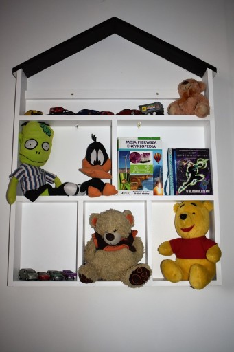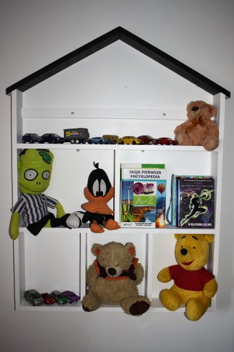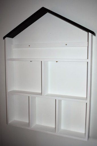 Na sprzedaż mam wiszącą półke na zabawki w kształcie domku,półka została wykonana ręcznie z litego drewna sosnowego i pomalowana farba ekologiczną , półka nie posiada płyty tylnej. Posiada listwę montażową z otworami o średnicy 8 mm należy kupić kółki rozporowe odpowiednie do ściany na której będzie zamontowana półka