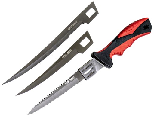 Wysokiej jakości, niezwyke ostry nóż z trzema wymiennymi ostrzami do filetowania ryb znanej i cenionej firmy Mistrall. Dzięki niemu bez problemów obierzesz ze skóry lub wytniesz ości z każdej ryby nawet największego okazu. Trzy ostrza wykonane z wysokiej jakości tytanu. Ostrza w różnych konfiguracjach (jedno ostrze gładkie, drugie w połowie gładkie i ząbkowane, zaś ostanie z dwoma rodzajami ząbków) przetną nawet najgróbszą ość i najtwardszą skórę. Rękojeść wykonana z mocnego tworzywa ABS z dodatkowo wtopionymi elementami gumowymi. Specjalnie wyprofilowana rękojeści powoduje, że nóż wygodnie i pewnie leży w dłoni, a antypoślizgowa guma zabezpiecza przed wyślizgnięciem i wypadnięciem noża z dłoni. Kabura z grubego dodatkowo utwardzonego materiału, z osobnymi kieszeniami na ostrza oraz uchwytem do założenia na pasek spodni, zapinana na rzep.